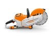 Bovendien kan je de doorslijpschijf heel eenvoudig vervangen: schakel de asblokkering in, draai de bevestigingsschroef los met een steeksleutel en draai na het vervangen de schijf weer vast. Andere praktische uitrustingen: de vertragende rem die de doorslijpschijf in slechts enkele seconden vertraagt en de STIHL magnesium beschermkap met geïntegreerd doseerkraantje.