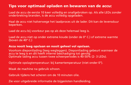 Lange levensduur en duurzaam. De looptijd met een volle accu is onbelast 70 minuten, de effectieve belaste scheertijd is 45 minuten. Zeer goed uitgebalanceerd, krachtig en duurzaam.