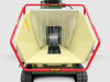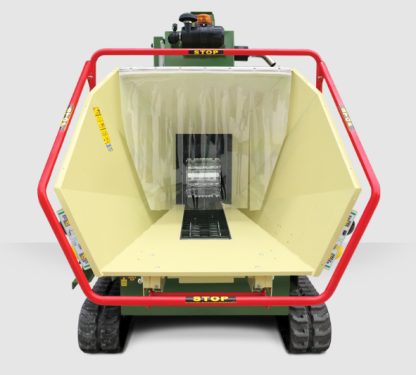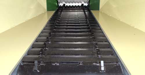 - Invoertrechter met stalen aanvoertapijt en rol, hydraulisch regelbaar en omkeerbaar.